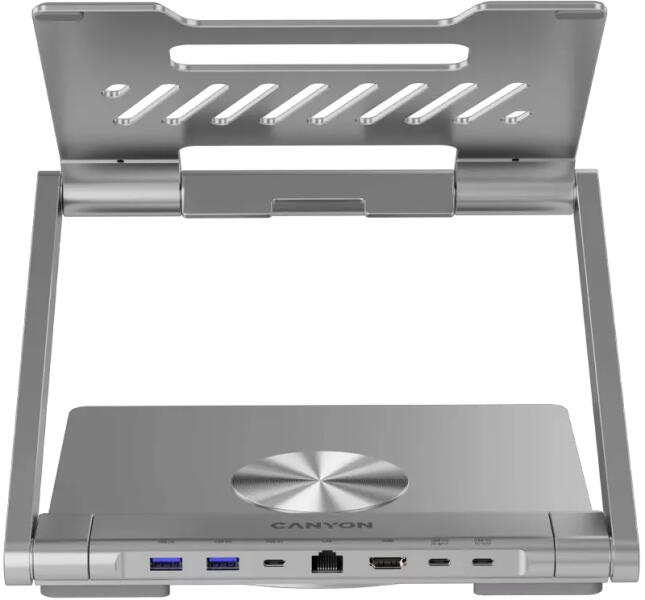Canyon Laptop stands with hub, TYPE C F to HDMI2.0+2USB3.0+USBC3.0+RJ45+PD, TYEP C TO C cable 1m white with Emarker: HUSB332A, Material: Aluminum case+ABS+PS, Size: 245x240x27.2+/-0.3mm, Weight: 1304g
